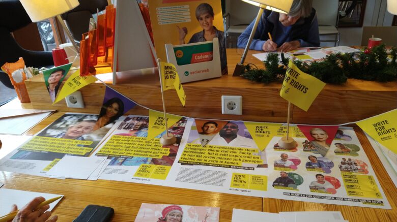 Naast de “thuisschrijvers” met een individueel schrijfpakket konden we dit jaar ook aan aantal mensen ‘live’ ontvangen op twee Write for Rights bijeenkomsten: in de Allemanswaard bibliotheek in Amerongen (op 9 december) en in de Bibliotheek van Driebergen (op 10 december).